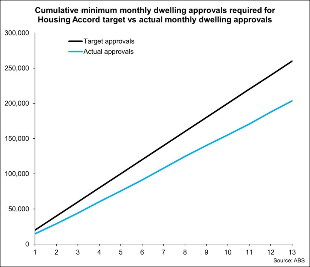 The Housing Accord (a federal budget target) aims to deliver 1.2 million new homes between July 2024 and June 2029, that’s around 20,000 approvals per month for five years. Given the target has never been achieved before, and a minimum of 1.2 million homes need to be sought for this to be achieved, it is going to be a challenge, and perhaps an unrealistic goal.
